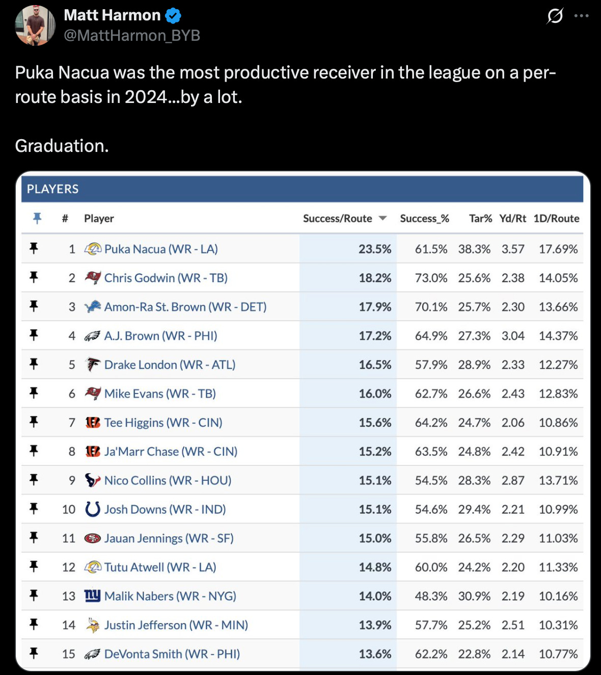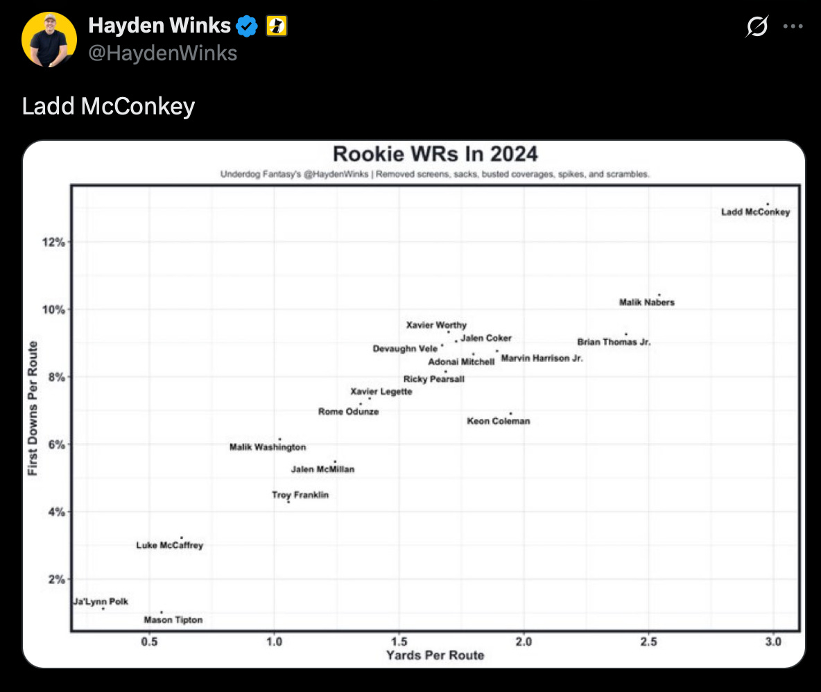 Los Angles Chargers - Ladd McConkey was very good in his rookie season. He lead all rookies in YPRR, as you can see in the chart below. Three rookie WRs finished in the top 20 in FPPG last season.