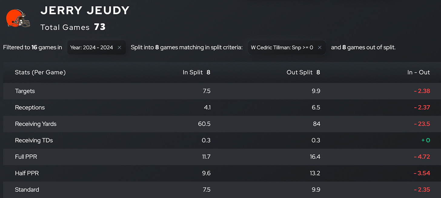 Cleveland Browns - Jerry Jeudy had a breakout year last season, but he actually didn’t fully breakout until after Cedric Tillman went down with an injury. Jeudy averaged 9.6 FPPG with Tillman on the field and 13.2 FPPG with him on the sideline.