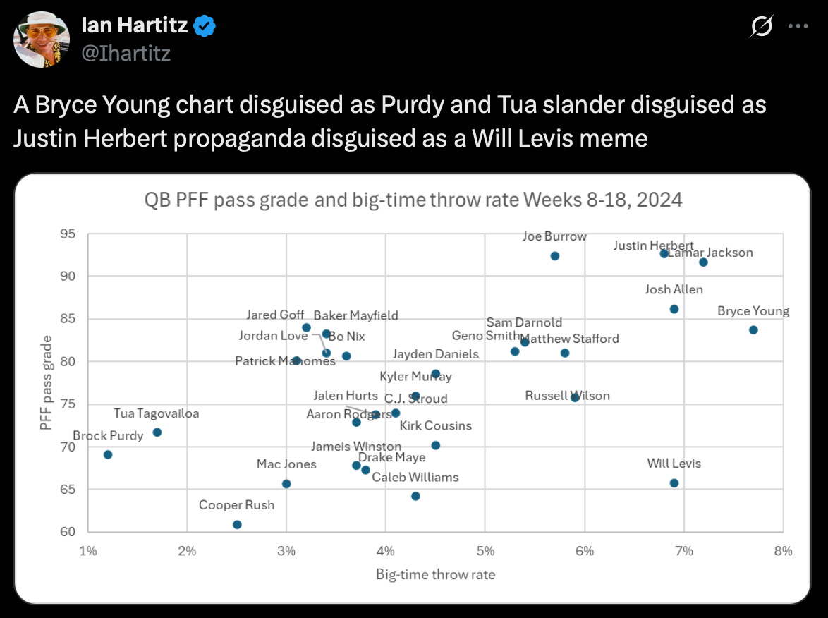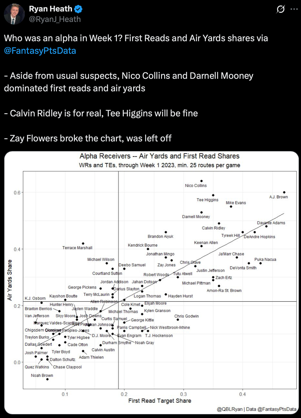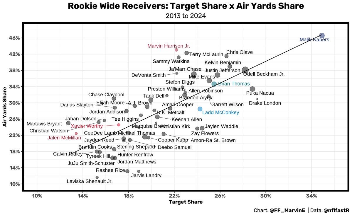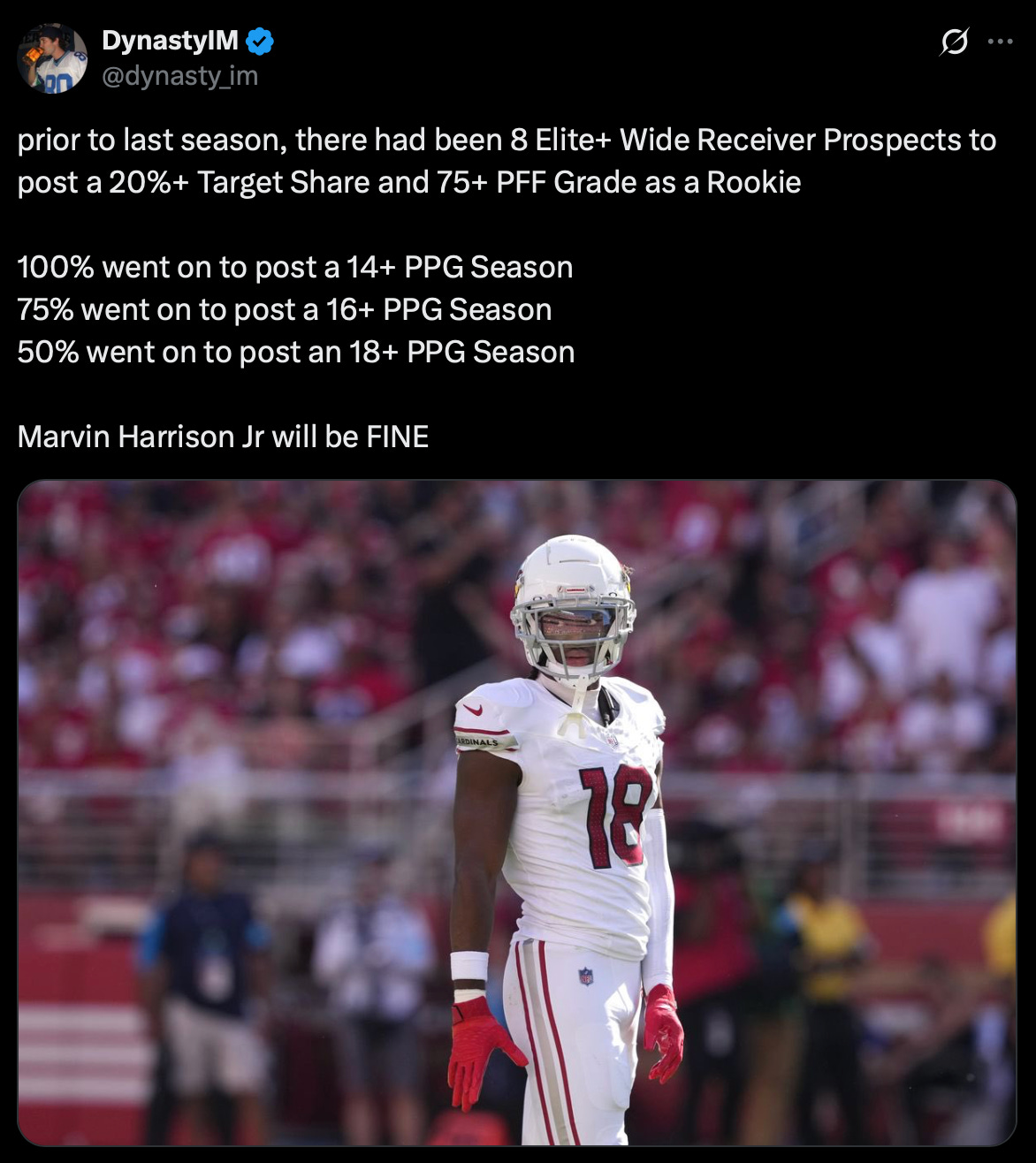 Arizona Cardinals - Marvin Harrison Jr. finished with a 22% target share and 43% air yards share. As it says in the tweet below, Marvin Harrison is gonna be just fine.