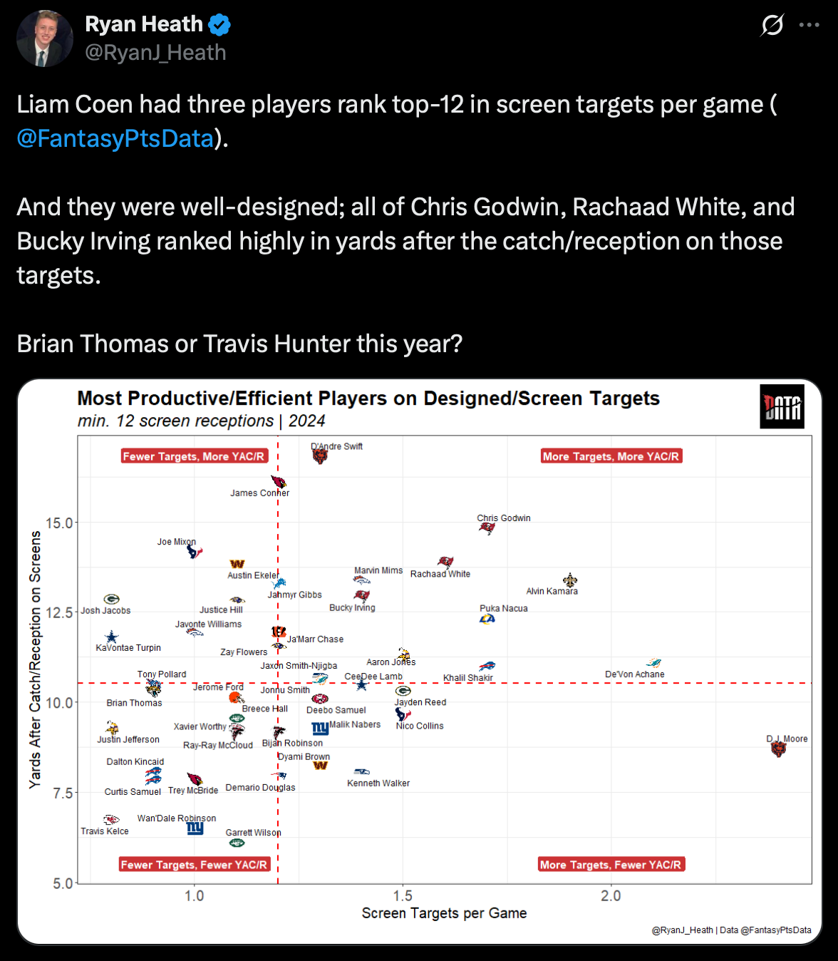 Jacksonville Jaguars - As you can see in the tweet below, Liam Coen had three players ranked in the top-12 in screen targets per game last season. Travis Hunter had 21 MTF last season, per PFF. He is a playmaker with the ball in his hands and he will see a good amount of opportunities to show that skillset off in the NFL with Coen calling plays.