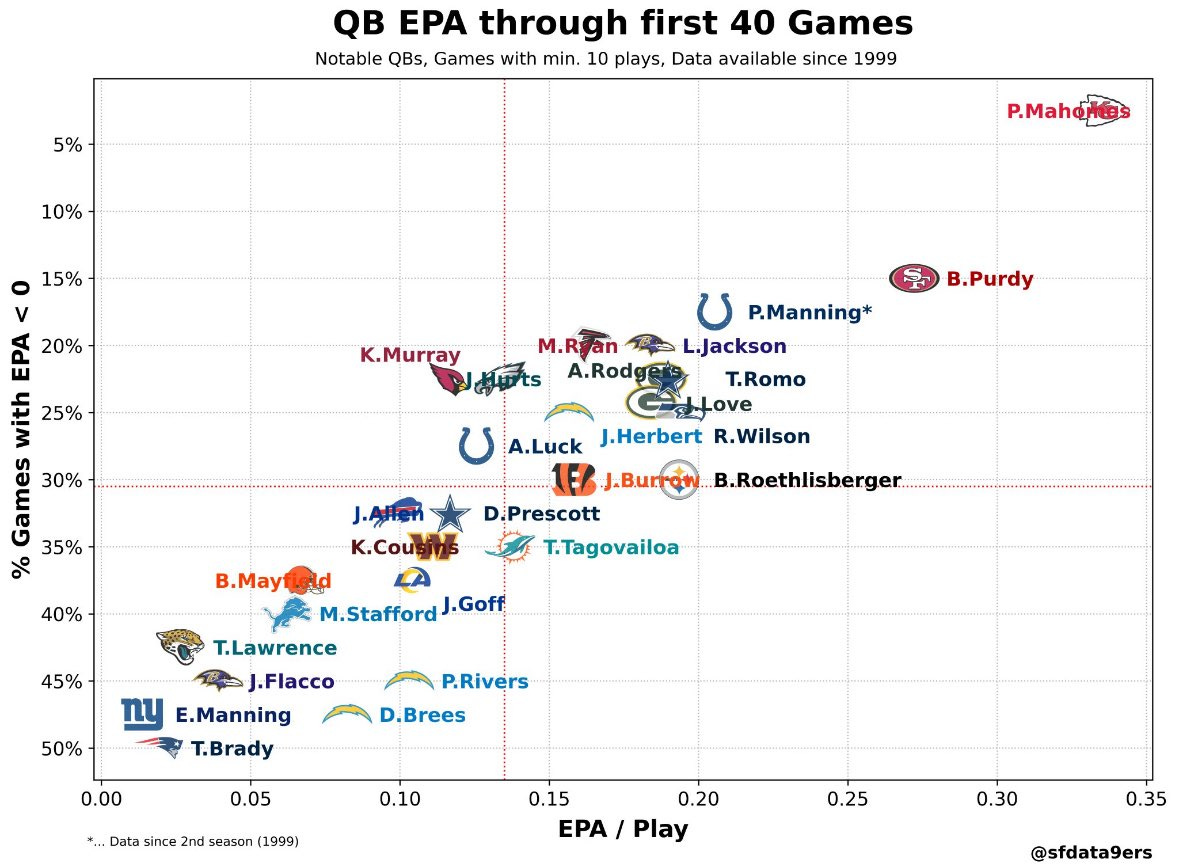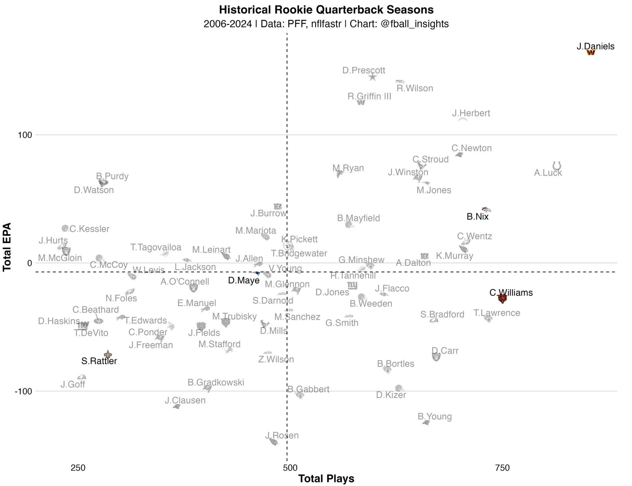 Washington Commanders - Jayden Daniels was arguably the best quarterback in his draft class last season. He won OROY and led his team to their first NFC Championship berth since 1991. As you can see in the chart below, Daniels had one of the best quarterback seasons for a rookie. Daniels was the QB4 in FPPG. He is a locked and loaded QB1 for fantasy in all formats.