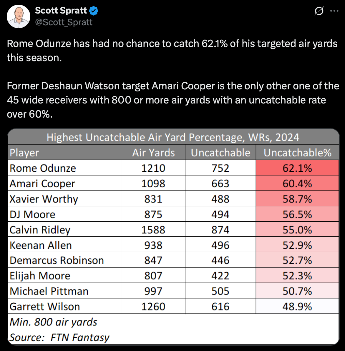 Chicago Bears - Rome Odunze had 752 uncatchable air yards last season. The addition to Ben Johnson should take some heat off of Caleb Williams this year. Last season Williams ranked 27th in Pro Football Focus’ passing grade under pressure.