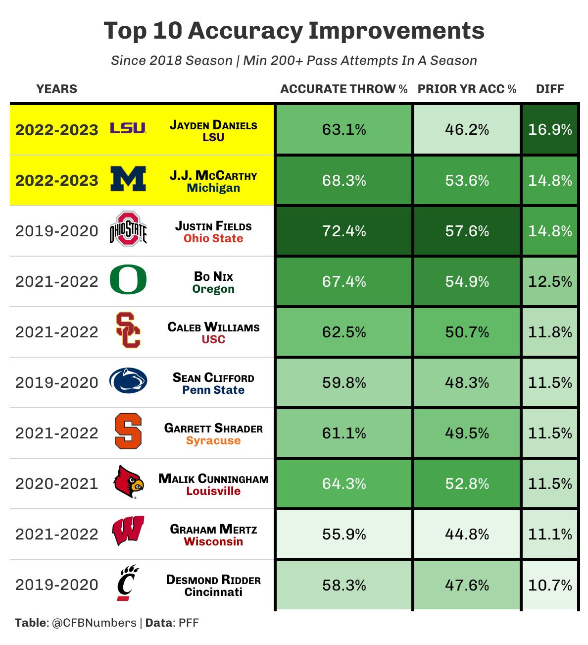 Minnesota Vikings - The Vikings decided to move on from Sam Darnold and roll with their 2nd year quarterback J.J. McCarthy. Since 2018, McCarthy was the 2nd most improved in accurate throw percentage in his final collegiate season. McCarthy could be the final infinity stone for Kevin O’Connell’s offense.