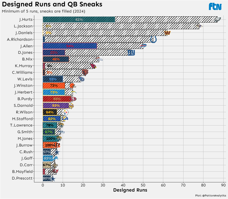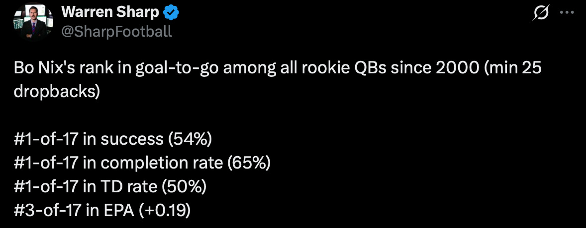 Denver Broncos - Bo Nix was pretty, pretty good in goal-to-go situations during the 2024 season. Nix was the QB10 in FPPG this past season and he has the luxury of being in one of the best called offenses in the league under Sean Payton.