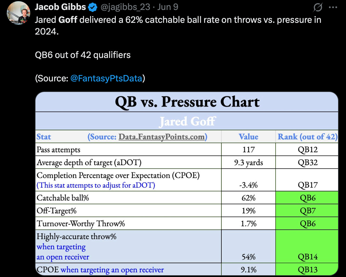 Detroit Lions - The Lions not only lost Ben Johnson this offseason, they also lost two interior offensive lineman. While I think he offense could take a step back, I believe they could still be a top 10 unit with how well Jared Goff plays under pressure. Goff ranked 6th in catchable ball rate under pressure in 2024, as you can see below.