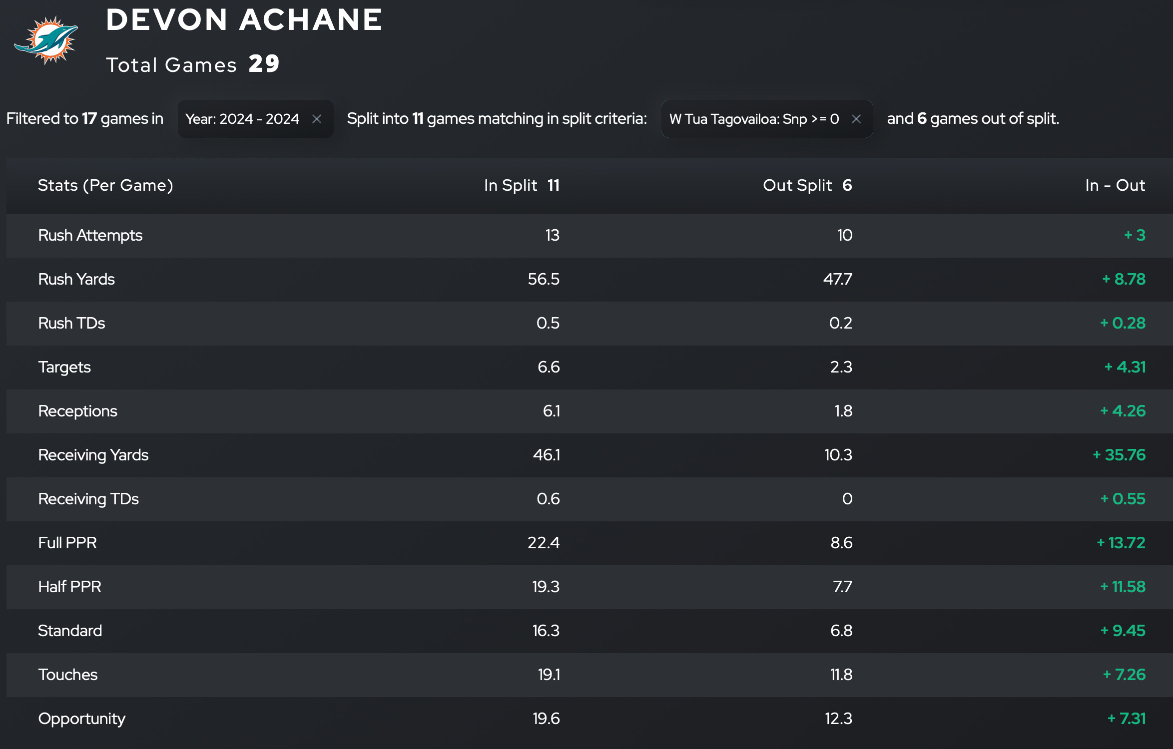 Miami Dolphins - If we could wrap Tua Tagovailoa in something that would prevent him from getting concussions, that’d be great. Last season De’Von Achane averaged 22.4 FPPG in 11 games with Tua starting and 8.5 FPPG in the 6 games he was out with an injury. 22.4 FPPG would have been good for the overall RB1 last season.