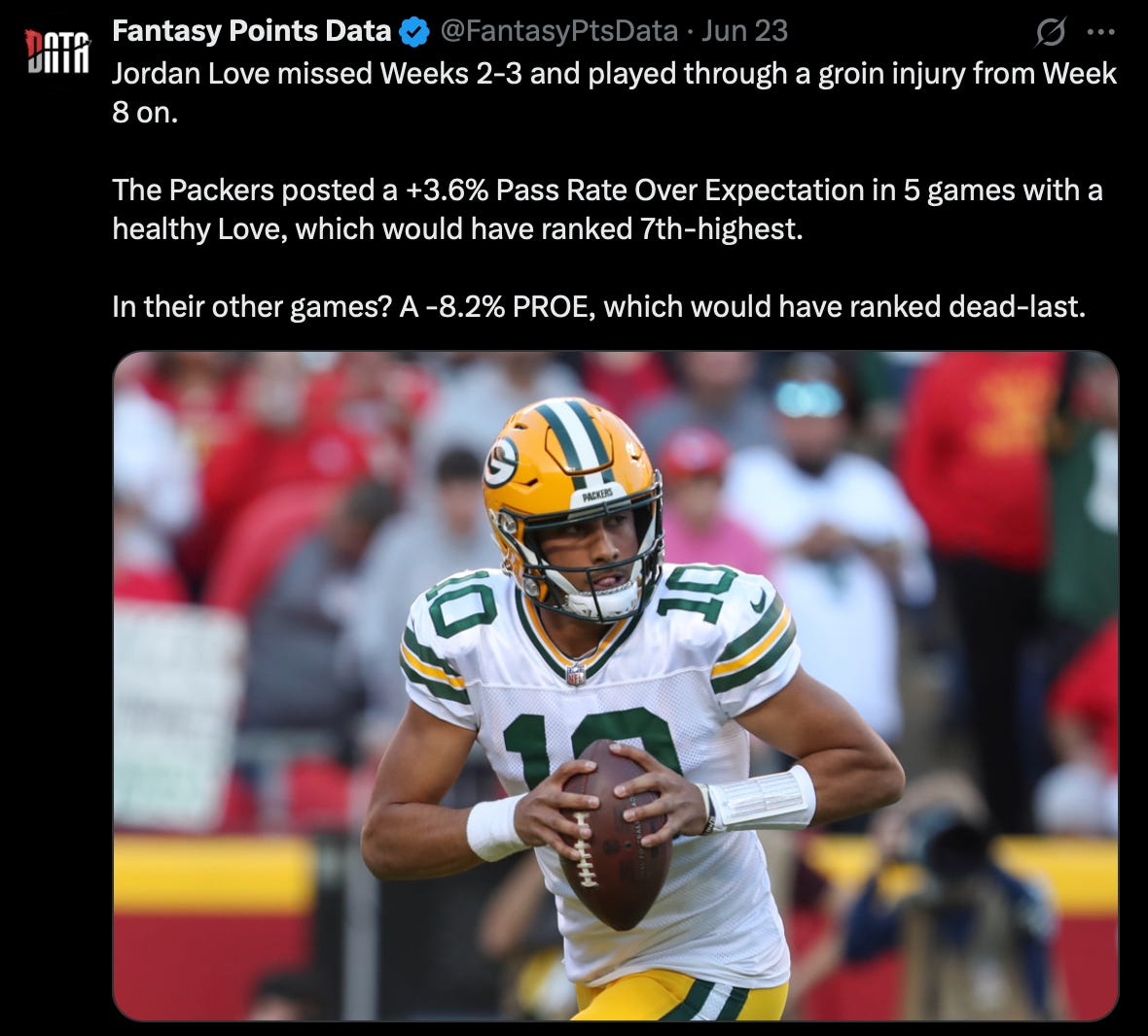 Green Bay Packers - With a healthy Jordan Love on the field the Packers can yield one of the better offenses in the league. In 2023, when Love played the full season, he threw for 4,159 yards and 32 passing touchdowns. The Packers offense ranked 8th in points per game that season.