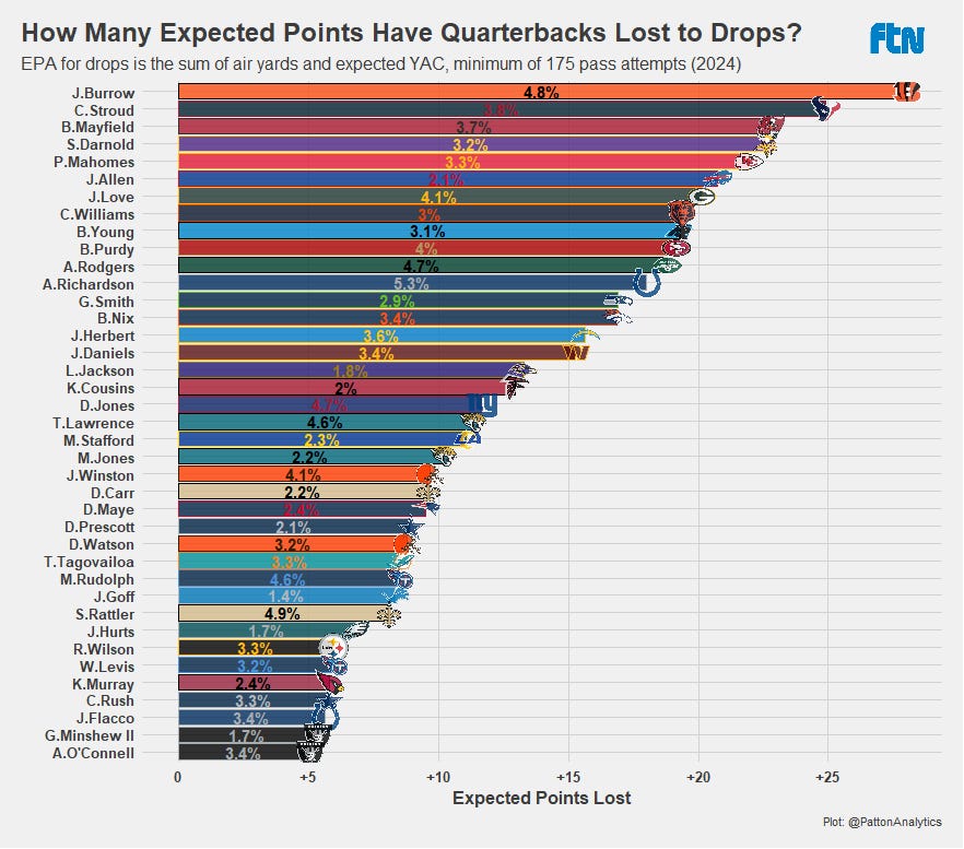 Houston Texans - There was a lot of meat left on the bone in the passing game last season. As you can see in the chart below, C.J. Stroud was 2nd in lost EPA to drops last season behind only Joe Burrow. I expect the passing offense to be better this season with a healthy Nico Collins and the addition of Jaylin Noel and Jayden Higgins.