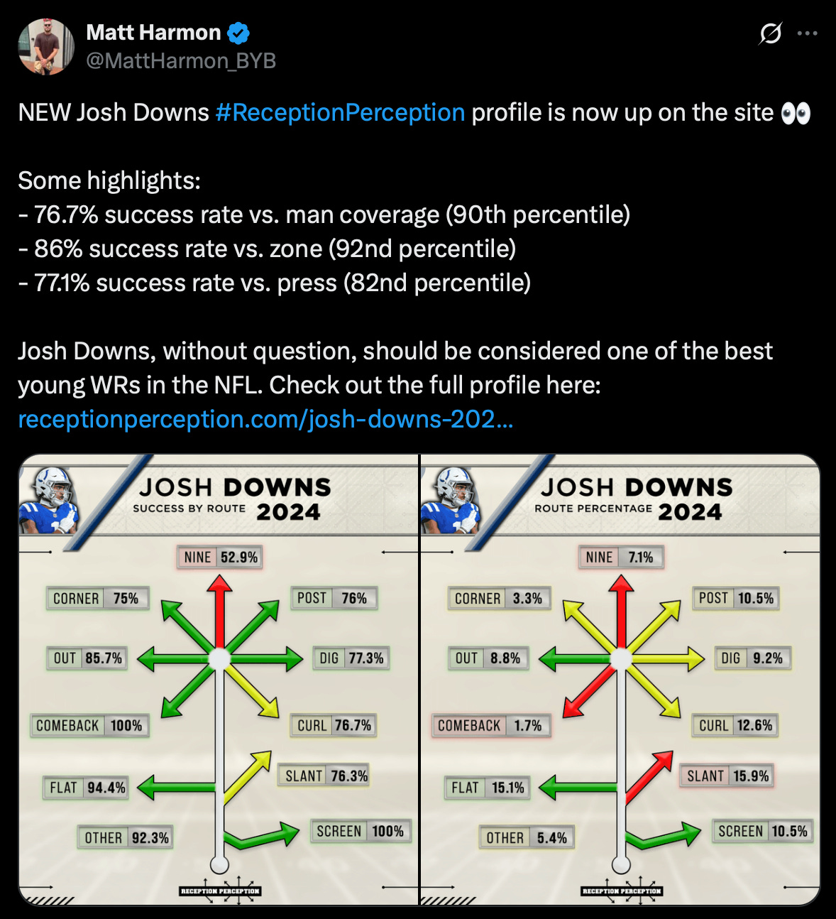 Indianapolis Colts - Josh Downs had a 90th percentile success rate against man coverage last season. You can check out his full Reception Perception profile here. Downs was on pace to lead the Colts in targets, receptions and receiving yards last season if he hadn’t missed three games.