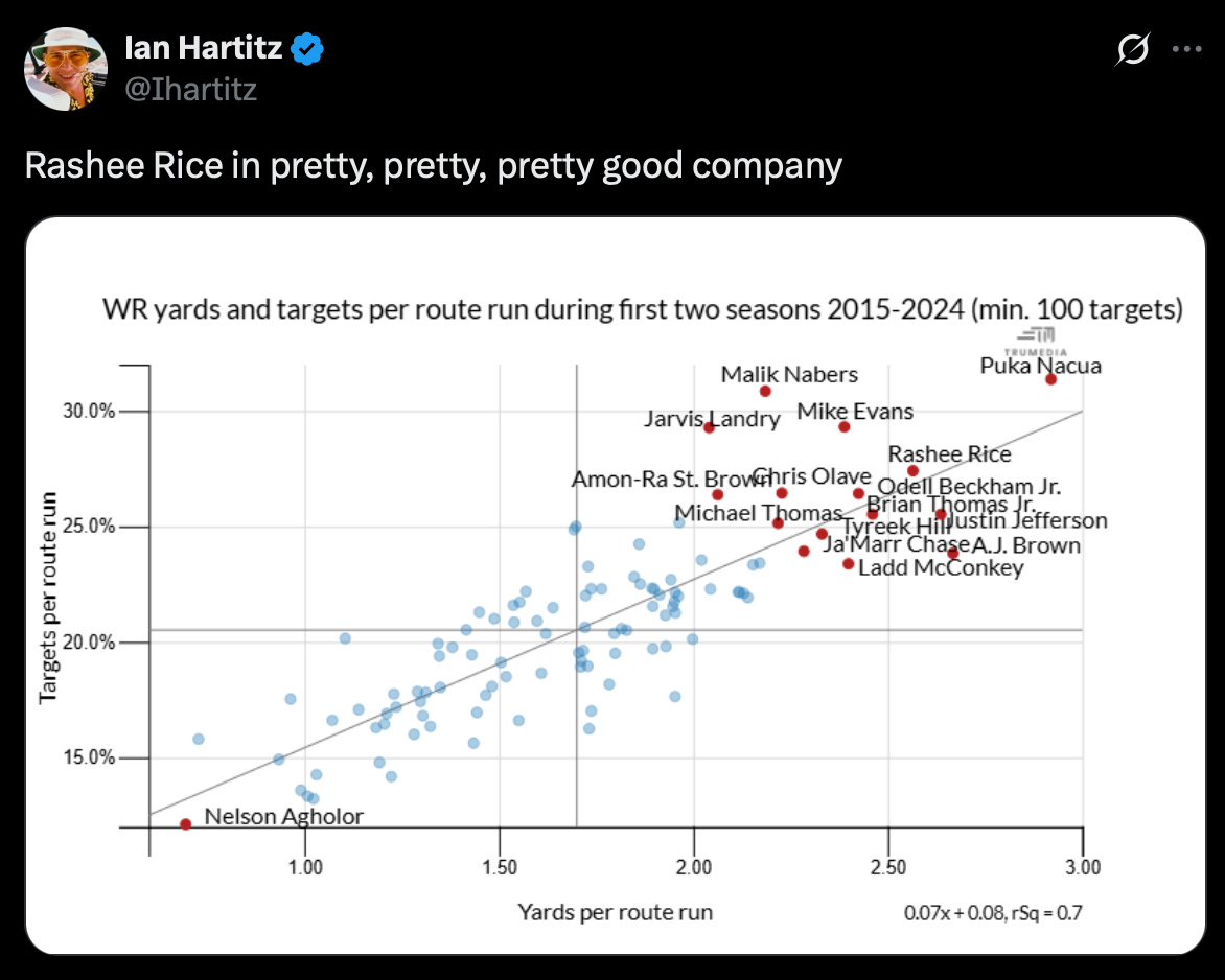 Kansas City Chiefs - Weeks 1-3 before suffering an injury Rashee Rice was the WR2 in FPPG. Rice also averaged 17 FPPG weeks 10-18 of the 2023 season, which would have been good for the WR13. As you can see in the chart below, Rice is in pretty good company and these last two seasons appear not to be a fluke. It also helps that he has the best quarterback in the NFL passing him the ball.