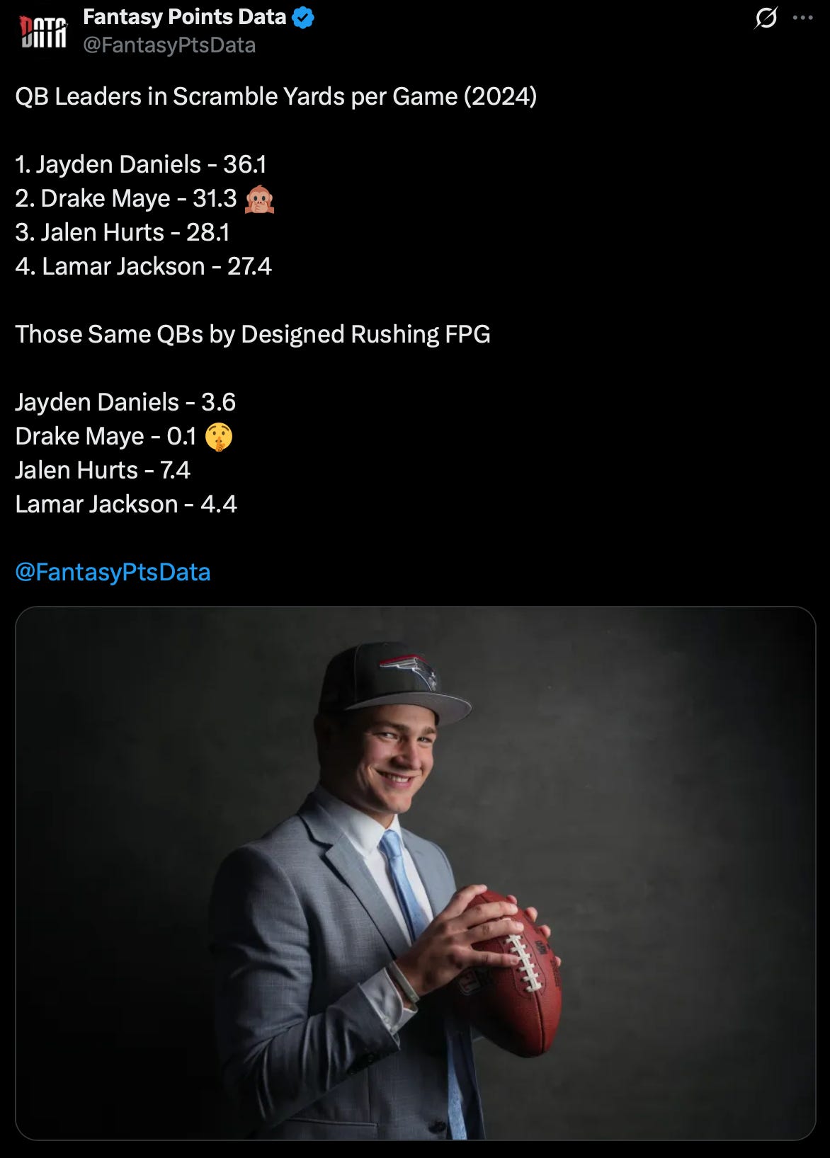 New England Patriots - Drake Maye rushed for 421 yards and two touchdowns in 13 games last season. In the nine games that Maye played in at least 90% of the snaps his FPPG was good for QB11. Maye’s rushing ability provides a safe floor for fantasy football.